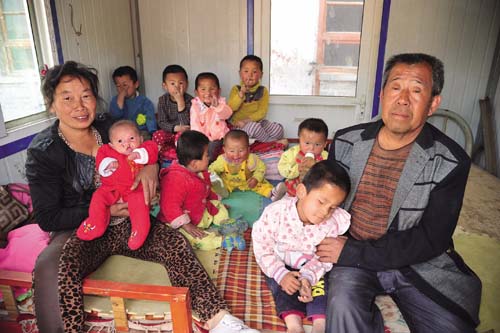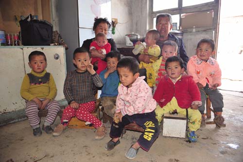 原來,張滿亮的妻子在附近的礦山企業(yè)打工當(dāng)廚師,在回家的途中遇到一個被父母遺棄路邊的殘疾棄嬰,在那里哇哇大哭,她左思右想不忍心,就將殘疾棄嬰抱回家撫養(yǎng),丈夫張滿亮不僅不嫌棄,還搭手幫忙。從此開始,得知張滿亮夫婦是樂做善事熱心人的縣民政局和周邊村民,就接連不斷地將殘疾棄嬰給張滿亮夫婦送來,他倆二話不說全部接納收養(yǎng),6年來一共接納了9名。隨著殘疾兒童的增多,自家房屋缺少沒法養(yǎng),村集體就將舊學(xué)校的幾間房屋騰出來讓他倆占用?,F(xiàn)在9名棄嬰,最大的五六歲,最小的才五個月,均有殘疾,有的兔嘴、缺耳、缺胳膊、雙目失明,有的患肌肉萎縮、肺腫大、心臟病、疝氣。張滿亮夫婦以父母般的愛心撫養(yǎng)照料這些孩子,還給起了很好聽的名字:張?zhí)炖?、張?zhí)煊?、張?zhí)祜L(fēng)、張?zhí)煸?、張?zhí)觳?、張?zhí)鞂?、張?zhí)旎ā堺惢?、張彩花。他倆與二兒媳董艷紅精心照料著殘疾兒童的一日三餐和生活起居,穿衣喂飯,潑奶哺乳,擦屎倒尿,大哭小叫,不厭不煩,起早貪黑,周而復(fù)始,以人間大愛撫育著這些殘疾兒童健康的成長。