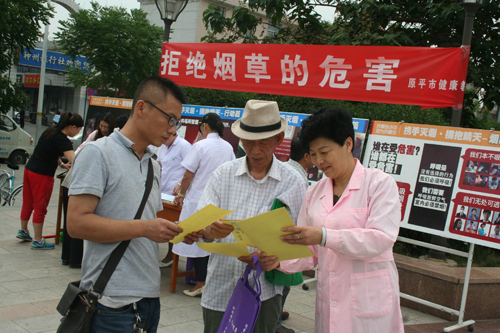 5月31日是“世界無煙日無煙日“原平市組織有關(guān)人員開展多種形式的宣傳創(chuàng)建無煙環(huán)境,提醒市民認識吸煙者影響身體健康和污染環(huán)境的危害性。(趙月仁 攝)