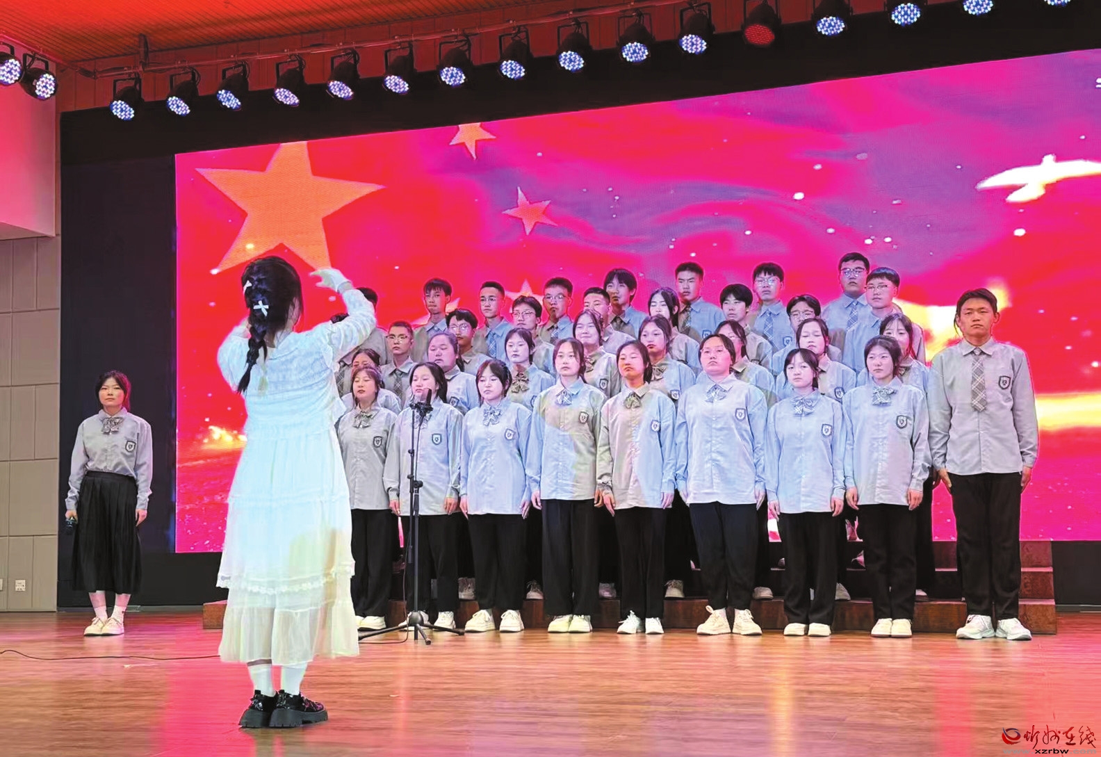 “少年智則國智,少年富則國富,少年強(qiáng)則國強(qiáng)……”比賽伊始,師生們齊聲誦讀《少年中國說》,用一句句激情澎湃、振奮人心的話語,表達(dá)了對國家的熱愛和對未來的憧憬。隨后,一場融合多種元素的歌詠比賽正式展開。各參賽班級精神飽滿、熱情四溢,演繹了《光榮??!中國共青團(tuán)》《歌唱祖國》《巡光》《年少的你啊》等歌曲,展現(xiàn)出新時代青年學(xué)子的蓬勃朝氣和堅定信念。