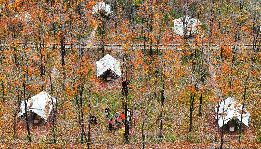 樹上生產(chǎn)力,樹下購買力。霜降時(shí)節(jié),位于定襄縣東峪自然保護(hù)區(qū)戎家莊的露營基地柿林內(nèi),村民忙著在樹上摘柿子,游客等著在樹下買柿子,給這個(gè)美麗的秋天,編織出一幅祥和的圖景。(張晉蘭 攝