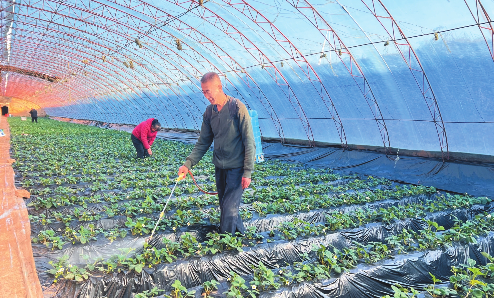 初冬寒意漸濃,河曲縣唐家會(huì)村的溫室大棚里卻充滿(mǎn)生機(jī),張俊田夫婦正細(xì)致地給草莓做噴灑養(yǎng)護(hù)。(