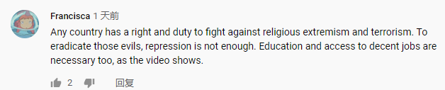“任何國家都有權(quán)利和義務(wù)打擊宗教極端主義和恐怖主義。要根除這些邪惡……教育和獲得體面工作的機(jī)會(huì)也是必要的?!苯?,一名海外網(wǎng)友Francisca在看完中央廣播電視總臺(tái)旗下CGTN播出的《巍巍天山——中國新疆反恐記憶》紀(jì)錄片后這樣評(píng)價(jià)。
