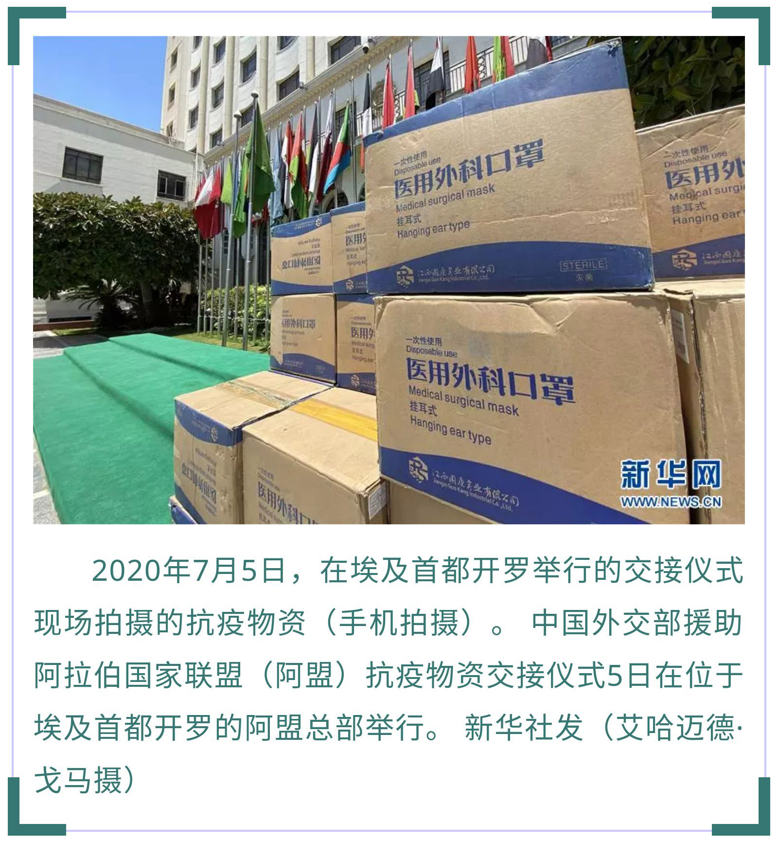 7月5日,中國外交部援助阿盟抗疫物資交接儀式在開羅舉行。中國駐埃及大使廖力強代表中國外交部向阿盟副秘書長胡薩姆·扎基移交了防護(hù)口罩。據(jù)廖力強介紹,新冠疫情暴發(fā)以來,中方向阿拉伯國家援助了大量物資,毫無保留地向阿拉伯國家分享抗疫經(jīng)驗和技術(shù),同21個阿拉伯國家舉辦了衛(wèi)生專家視頻會議,向8個阿拉伯國家派遣了醫(yī)療組,同時協(xié)助阿拉伯國家在中國采購抗疫物資,支持阿拉伯國家有序復(fù)工復(fù)產(chǎn)。