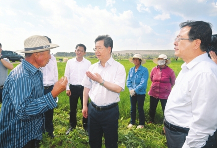 七月十三日,在右玉縣威遠(yuǎn)鎮(zhèn)小香蔥種植基地,省委書(shū)記樓陽(yáng)生向農(nóng)戶(hù)了解產(chǎn)業(yè)帶動(dòng)增收情況。山西日?qǐng)?bào)記者李聯(lián)軍攝