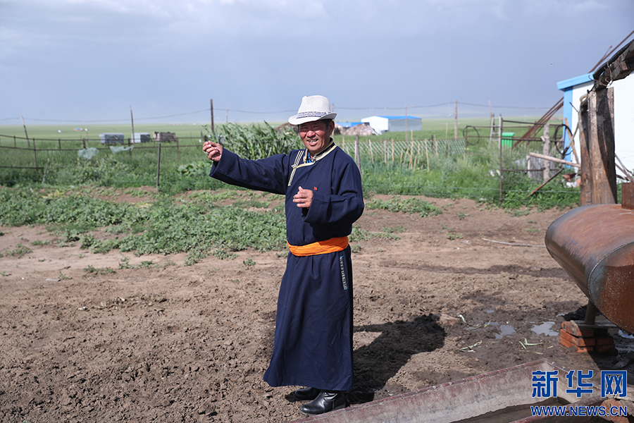 其日麥拉圖介紹自家草場。新華網(wǎng)記者 焦鵬攝