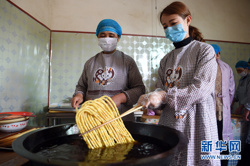 在東鄉(xiāng)族自治縣鎖南鎮(zhèn)鎖南村,馬娟(右)和員工一起加工油馃馃。(資料圖)新華社記者 范培珅 攝