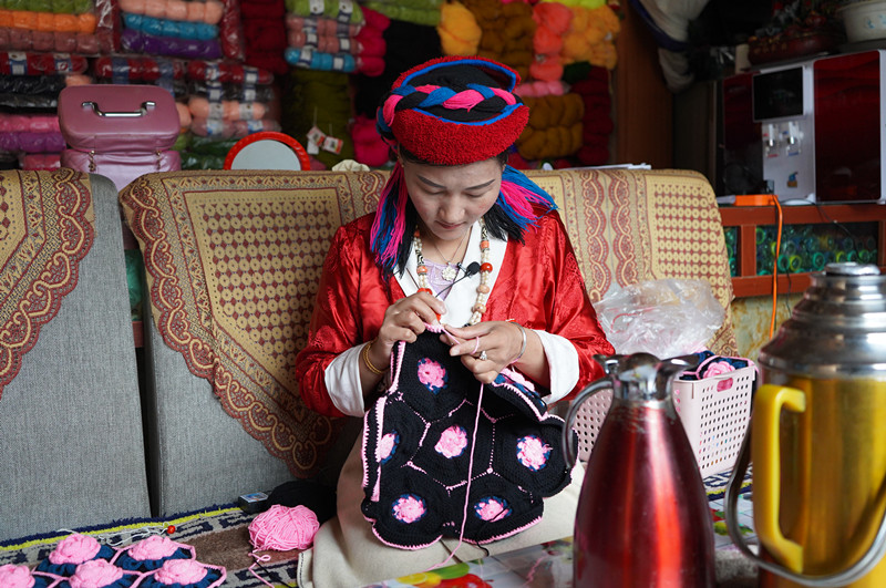 卓瑪正在家里用毛線編織著一對(duì)玫瑰花花色的抱枕套,這一對(duì)能賣400元。