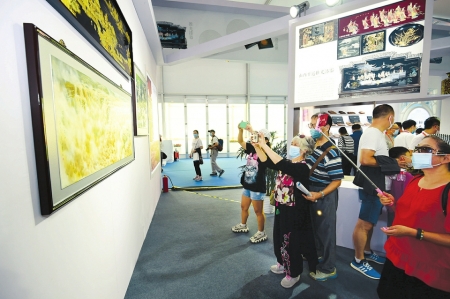 平遙推光漆作品展臺(tái)前,眾多觀展者在拍照留念。