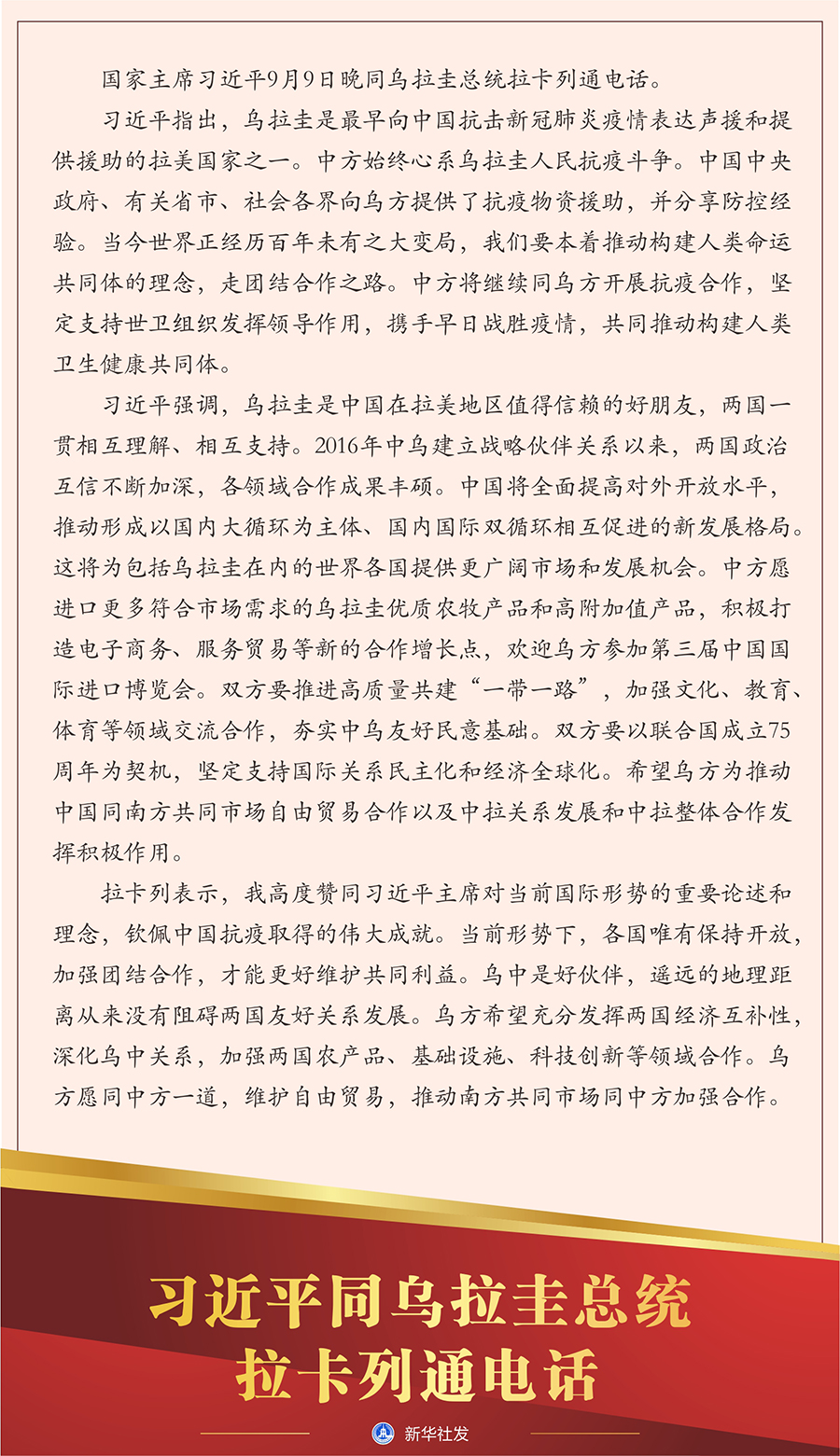 新華社北京9月9日電 國家主席習(xí)近平9月9日晚同烏拉圭總統(tǒng)拉卡列通電話。