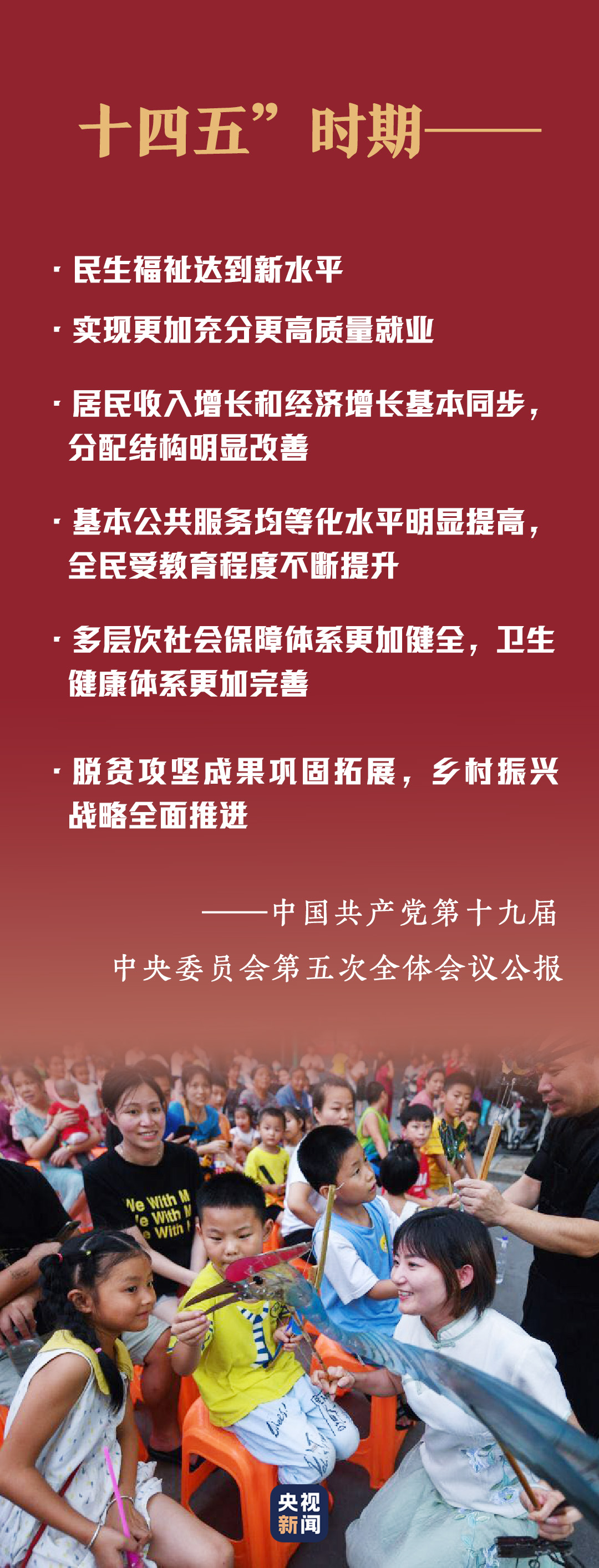 十九屆五中全會提出,不斷增強人民群眾獲得感、幸福感、安全感,促進人的全面發(fā)展和社會全面進步?!耙詽M足人民日益增長的美好生活需要為根本目的”“堅持以人民為中心,堅持新發(fā)展理念,堅持深化改革開放,堅持系統(tǒng)觀念”“改善人民生活品質(zhì),提高社會建設(shè)水平”......