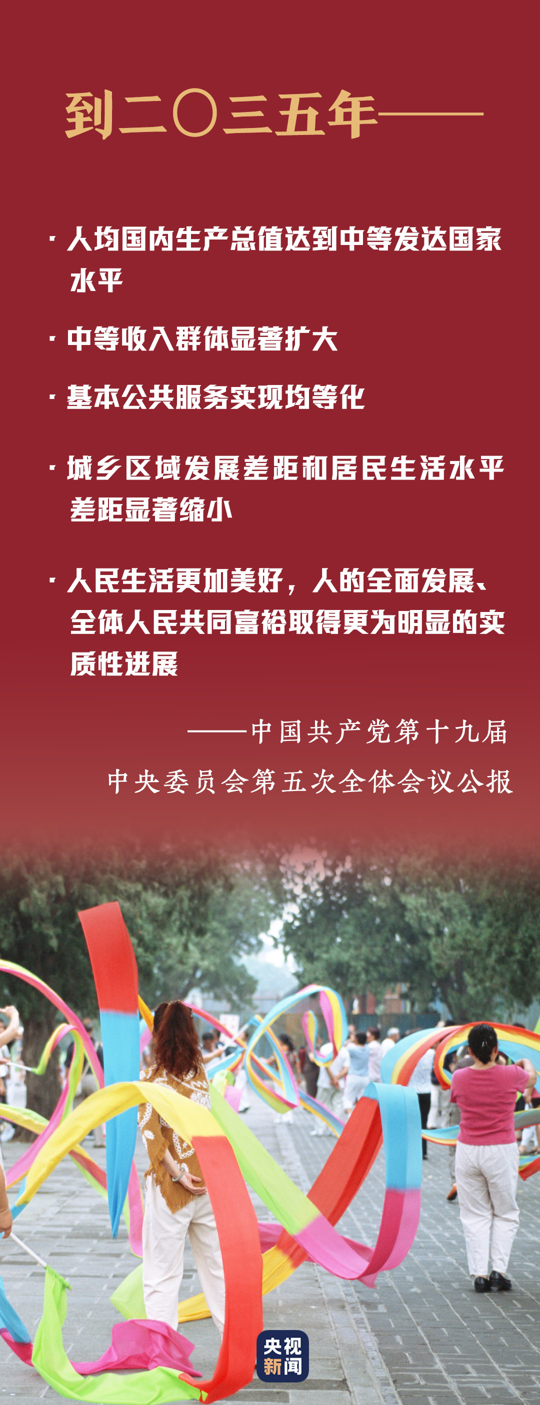 十九屆五中全會提出到二〇三五年基本實現(xiàn)社會主義現(xiàn)代化遠景目標。到那時,人民生活更加美好,人的全面發(fā)展、全體人民共同富裕取得更為明顯的實質(zhì)性進展。