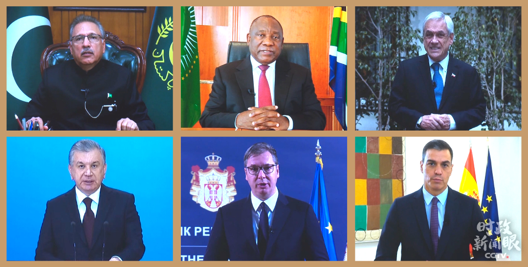 △開幕式現(xiàn)場,巴基斯坦總統(tǒng)阿爾維、南非總統(tǒng)拉馬福薩、智利總統(tǒng)皮涅拉、烏茲別克斯坦總統(tǒng)米爾濟(jì)約耶夫、塞爾維亞總統(tǒng)武契奇、西班牙首相桑切斯發(fā)表視頻致辭。