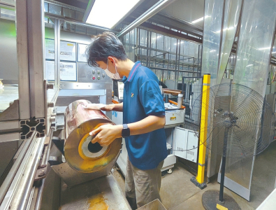 在運城制版集團的生產(chǎn)車間內(nèi),工作人員正在檢查鍍銅后的版輥。本報記者周明飛攝