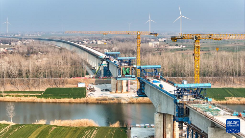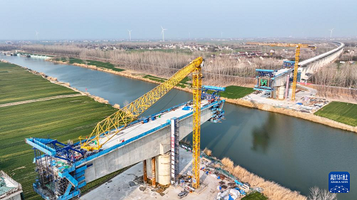 2月25日拍攝的中鐵四局阜淮鐵路跨渦河特大橋連續(xù)梁施工現(xiàn)場(chǎng)(無人機(jī)照片)。(新華社發(fā) 劉玉才 攝)