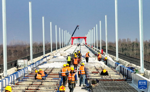 2月25日,中鐵四局阜淮鐵路項(xiàng)目建設(shè)者在蒙城特大橋施工(無人機(jī)照片)。(新華社發(fā) 劉玉才 攝)