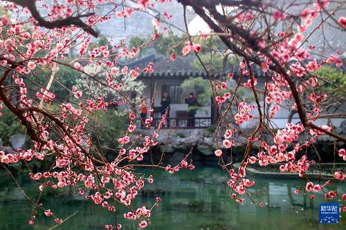 2月26日,游客在江蘇蘇州賞花游覽。(新華社發(fā) 王建康 攝)
