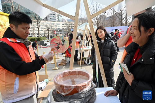 3月3日,志愿者為市民制作漆扇。(新華社記者 金良快 攝)