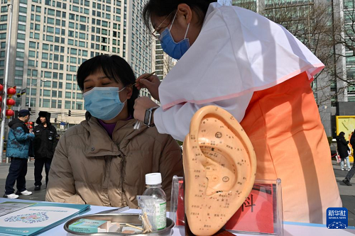 3月3日,北京市回民醫(yī)院志愿者為市民進(jìn)行耳穴貼治療。(新華社記者 金良快 攝)