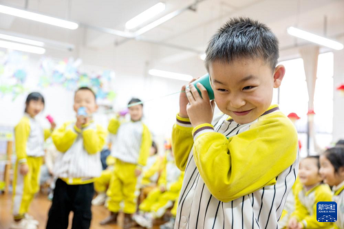 3月3日,浙江省湖州市長(zhǎng)興縣龍山幼兒園,孩子們利用自制的傳聲筒聽(tīng)取聲音。(新華社發(fā) 譚云俸 攝)