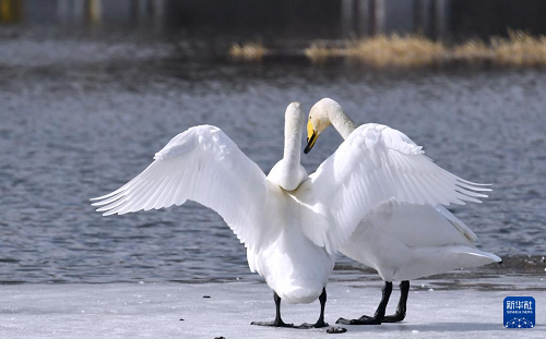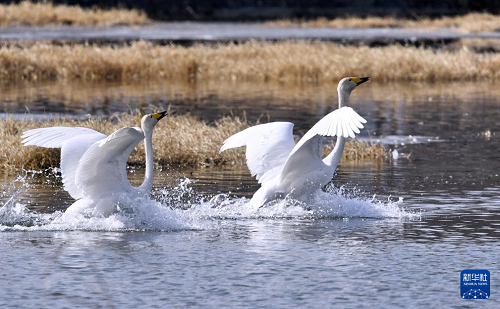 3月4日,天鵝在密云水庫(kù)流域的清水河嬉戲。(新華社記者 李欣 攝)