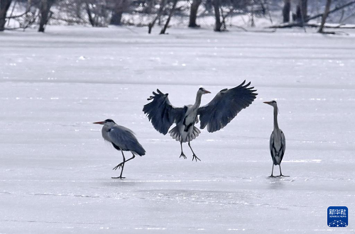 3月4日,蒼鷺在密云水庫(kù)未融化的冰面上嬉戲。(新華社記者 李欣 攝)