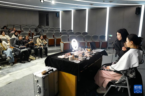 3月6日,人們?cè)诿缞y講堂學(xué)習(xí)化妝知識(shí)。當(dāng)日,浙江省湖州市美妝小鎮(zhèn)開(kāi)啟美好生活節(jié),設(shè)置美妝課堂、香氛展覽、美妝購(gòu)物等活動(dòng),吸引眾多女性觀眾前來(lái)參加。(新華社記者 翁忻旸 攝)