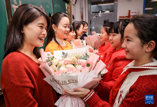 3月6日,湖北省武漢市未來(lái)實(shí)驗(yàn)美林小學(xué)學(xué)生為女教師獻(xiàn)上鮮花。(新華社發(fā) 趙軍 攝)
