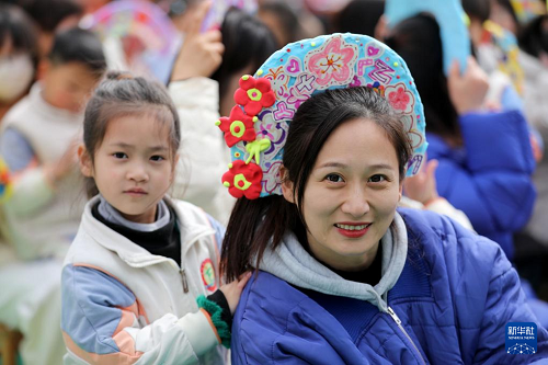 3月6日,在安徽省黃山市示范幼兒園開(kāi)展的“巧手學(xué)簪花 快樂(lè)迎‘三八’”主題活動(dòng)中,媽媽和孩子一起體驗(yàn)手工簪花制作。(新華社發(fā) 樊成柱 攝)
