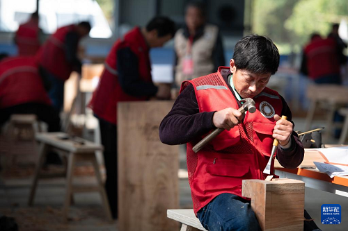 月6日,參賽選手在參加木作文物修復師項目比賽。(新華社記者 張端 攝)