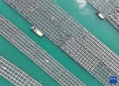 3月12日,漁民在連江縣苔菉鎮(zhèn)附近海域投放鮑魚苗(無人機(jī)照片)。(新華社記者 林善傳 攝)