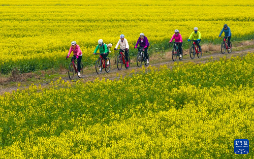 3月16日,騎行愛好者在安徽省蕪湖市繁昌區(qū)峨山鎮(zhèn)城東村的油菜花田間騎行。(新華社發(fā) 肖本祥 攝)