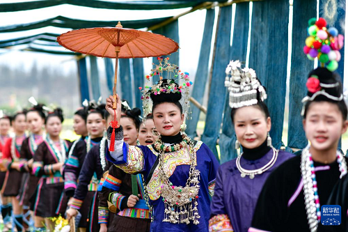 3月16日,在貴州省榕江縣車江大壩,村民們穿著民族盛裝參加花田走秀。(新華社記者 楊文斌 攝)