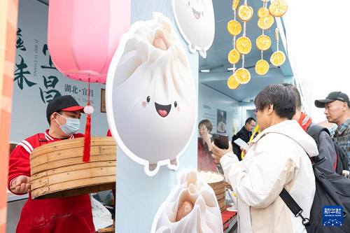 3月17日,消費者在2025年“中華美食薈”湖北宜昌攤位購買紅油包子。(新華社記者 肖藝九 攝)