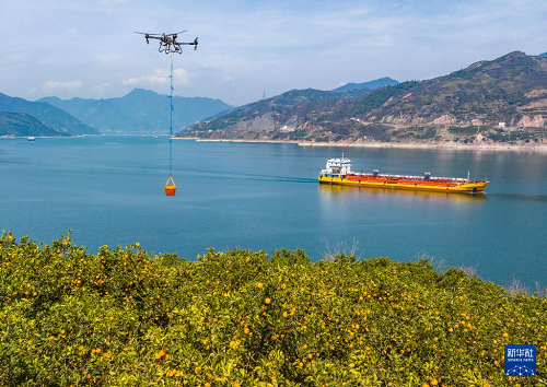 3月17日,湖北省秭歸縣郭家壩鎮(zhèn)鄧家坡村村民用無(wú)人機(jī)轉(zhuǎn)運(yùn)臍橙(無(wú)人機(jī)照片)。(新華社發(fā) 鄭家裕 攝)