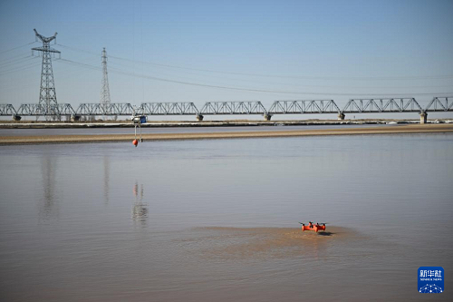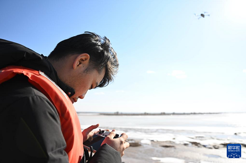 3月17日,在黃河內(nèi)蒙古呼和浩特市托克托縣段,黃河水利委員會(huì)寧蒙水文水資源局頭道拐水文站工作人員使用無(wú)人機(jī)監(jiān)測(cè)黃河流凌。(新華社記者 貝赫 攝)
