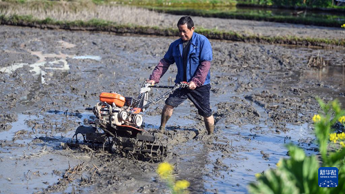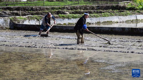 3月20日,廣西三江侗族自治縣良口鄉(xiāng)和里村農(nóng)民在耙田。(新華社記者 張愛林 攝)