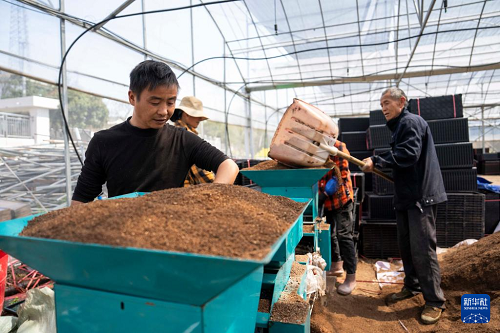 3月20日,在湖南省常德市漢壽縣巖汪湖鎮(zhèn)紅菱湖村,農(nóng)民在秧盤上鋪撒育秧土壤。漢壽縣是傳統(tǒng)產(chǎn)糧大縣,今年計(jì)劃早稻播種58.8萬畝,目前水稻育秧工作正在加緊進(jìn)行。(新華社記者 陳思汗 攝)