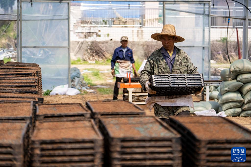 3月20日,在湖南省常德市漢壽縣巖汪湖鎮(zhèn)紅菱湖村,農(nóng)民在搬運(yùn)配置好的水稻秧盤。漢壽縣是傳統(tǒng)產(chǎn)糧大縣,今年計(jì)劃早稻播種58.8萬畝,目前水稻育秧工作正在加緊進(jìn)行。(新華社記者 陳思汗 攝)