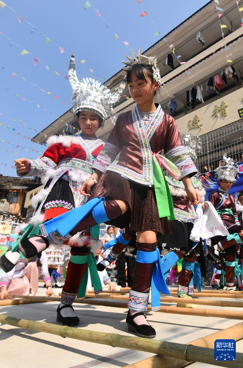 3月25日,柳州市融水苗族自治縣桿洞鄉(xiāng)中心小學(xué)學(xué)生在跳竹竿舞。(新華社記者 黃孝邦 攝)