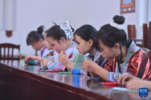 3月25日,柳州市融水苗族自治縣桿洞鄉(xiāng)中心小學(xué)學(xué)生在刺繡。(新華社記者 黃孝邦 攝)