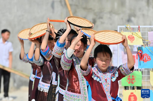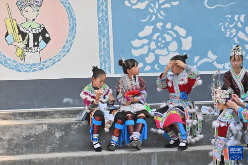 3月25日,柳州市融水苗族自治縣桿洞鄉(xiāng)中心小學(xué)學(xué)生進(jìn)行演出前的準(zhǔn)備。(新華社記者 黃孝邦 攝)