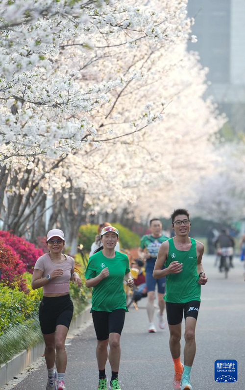 3月26日,人們?cè)跈鸦ㄅ艿琅懿?、騎行。(新華社記者 翁忻旸 攝)