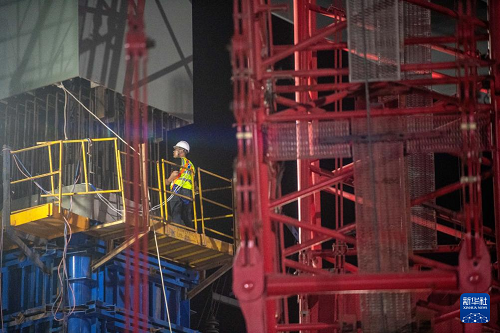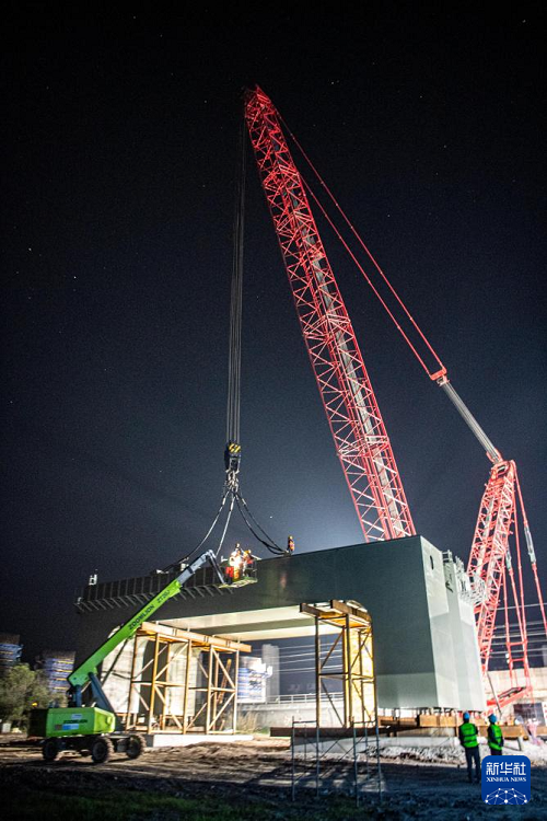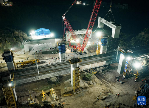 3月27日,在成達(dá)萬(wàn)高鐵建設(shè)現(xiàn)場(chǎng),施工人員在進(jìn)行高鐵鋼橫梁吊裝作業(yè)。(新華社記者 唐奕 攝)