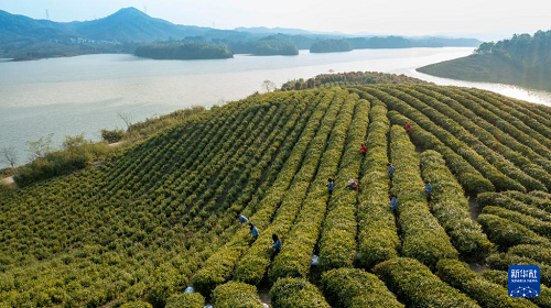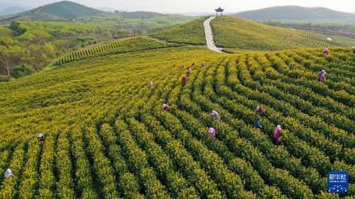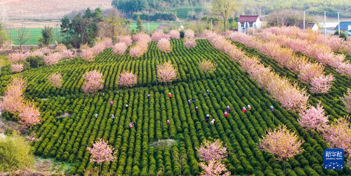 4月1日,在安徽省宣城市郎溪縣濤城鎮(zhèn)的一處茶園,茶農(nóng)們在采摘茶葉(無人機照片)。(新華社發(fā) 李曉紅 攝)