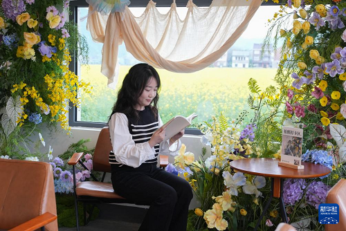 4月7日,游客在桐廬縣梅蓉村鄉(xiāng)村會客廳咖啡館內(nèi)閱讀。(新華社記者 黃宗治 攝)