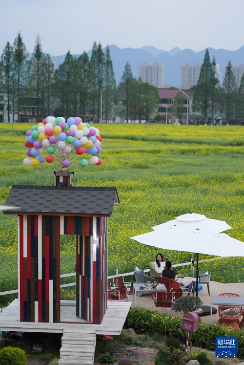 4月7日,游客在桐廬縣梅蓉村油菜花田內(nèi)游玩賞花。(新華社發(fā) 邱少煜 攝)