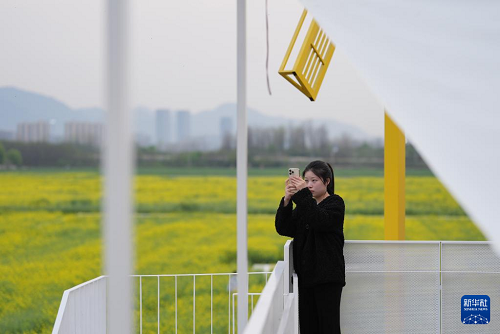 4月7日,游客在桐廬縣梅蓉村的油菜花田前拍照打卡。(新華社記者 黃宗治 攝)