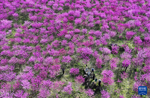 4月7日,游客在湖北省宣恩縣珠山鎮(zhèn)和平社區(qū)賞花游玩(無人機(jī)照片)。(新華社發(fā) 宋文 攝)