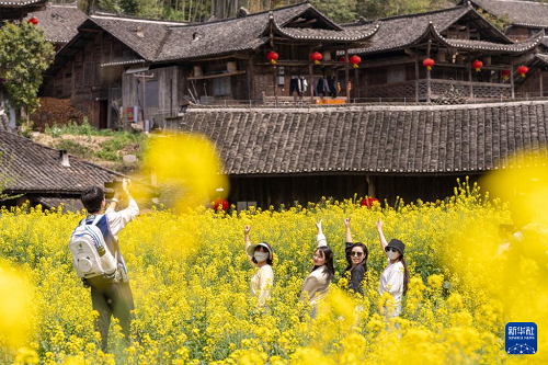 4月8日,游客在湖北省宣恩縣彭家寨吊腳樓前賞花游玩。(新華社發(fā) 王法鈞 攝)