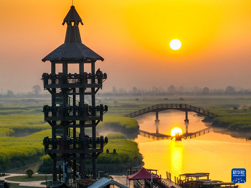 4月8日拍攝的江蘇省興化市千垛景區(qū)日出晨景(無人機(jī)照片)。(新華社發(fā) 周社根 攝)